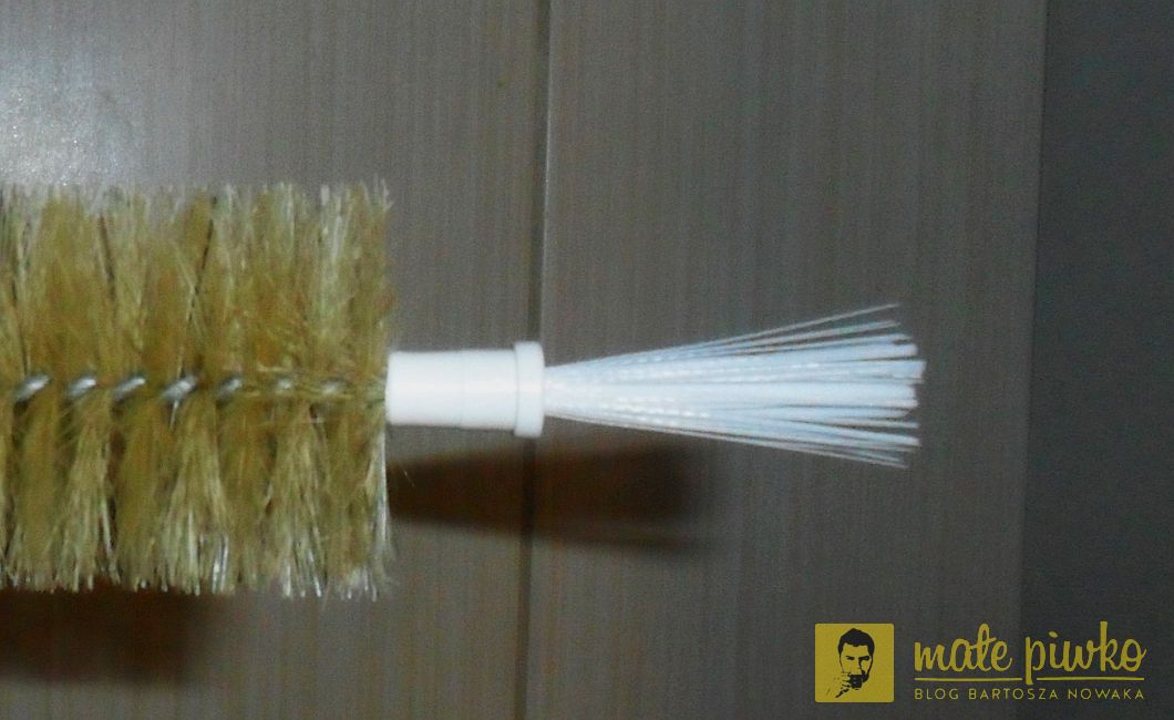 Taką szczotą świetnie umyjecie butelki i wąskie, wysokie szkło, w którym nie jesteście w stanie sięgnąć ręką dna. Natomiast średnio się ona nadaje do szkieł szerokich. Kufle, sniftery, goblety, tulipy, shakery, czy noniki polecam myć zwykłą czystą gąbką z płynem do mycia naczyń. Mycie bez płynu nic nie daje – z góry mówię. Ważne tylko by potem dobrze go spłukać dużą ilością zimnej wody. Najlepiej odłożyć sobie jedną gąbkę i przeznaczyć ją tylko do szkła na piwo. Po każdym użyciu dobrze ją wypłukać i wycisnąć, bo inaczej szybko zacznie Wam walić stęchlizną, co może potem przejść do piwa. Szkło radzę myć zaraz po spożyciu piwa, szczególnie to z trudno dostępnym dnem. Wiem, że to bywa trudne, więc w skrajnym przypadku wystarczy je chociaż zalać letnią wodą – jak już zbierzemy siły na zmywanie, będzie o wiele łatwiej. Warto też podczas mycia zadać sobie dodatkowy wysiłek i umyć szkło również z zewnątrz. No, bo jaka jest przyjemność picia z obtłuszczonej odciskami palców szklanki?